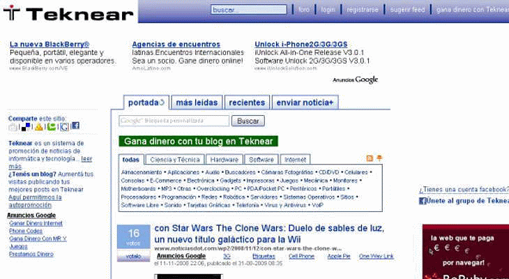 Otro de los «competidores» de Menéame. Te permitía indexar tus propios artículos, tal cual hace hoy Bloguers.net, de manera automática y gratuita. Se podía igualmente votar las noticias, la temática era de temas tecnológico e informática, y los artículos de bloguers que añadían sus contenidos. Y como siempre, la noticia que superaba un determinado nivel de karma y votos podía ser promocionada a la portada.